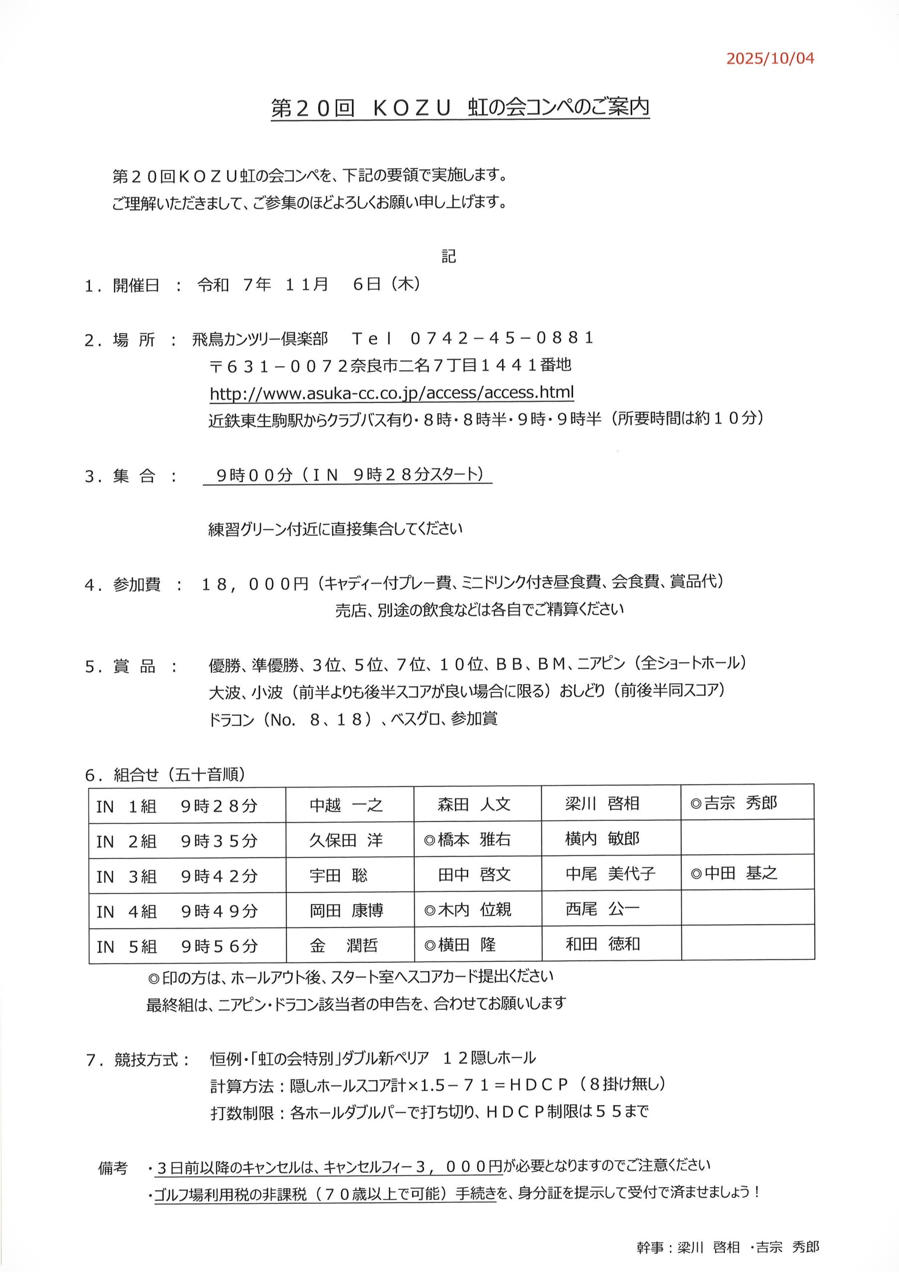 第20回KOZU虹の会ゴルフコンペ2025年(令和7年)11月6日